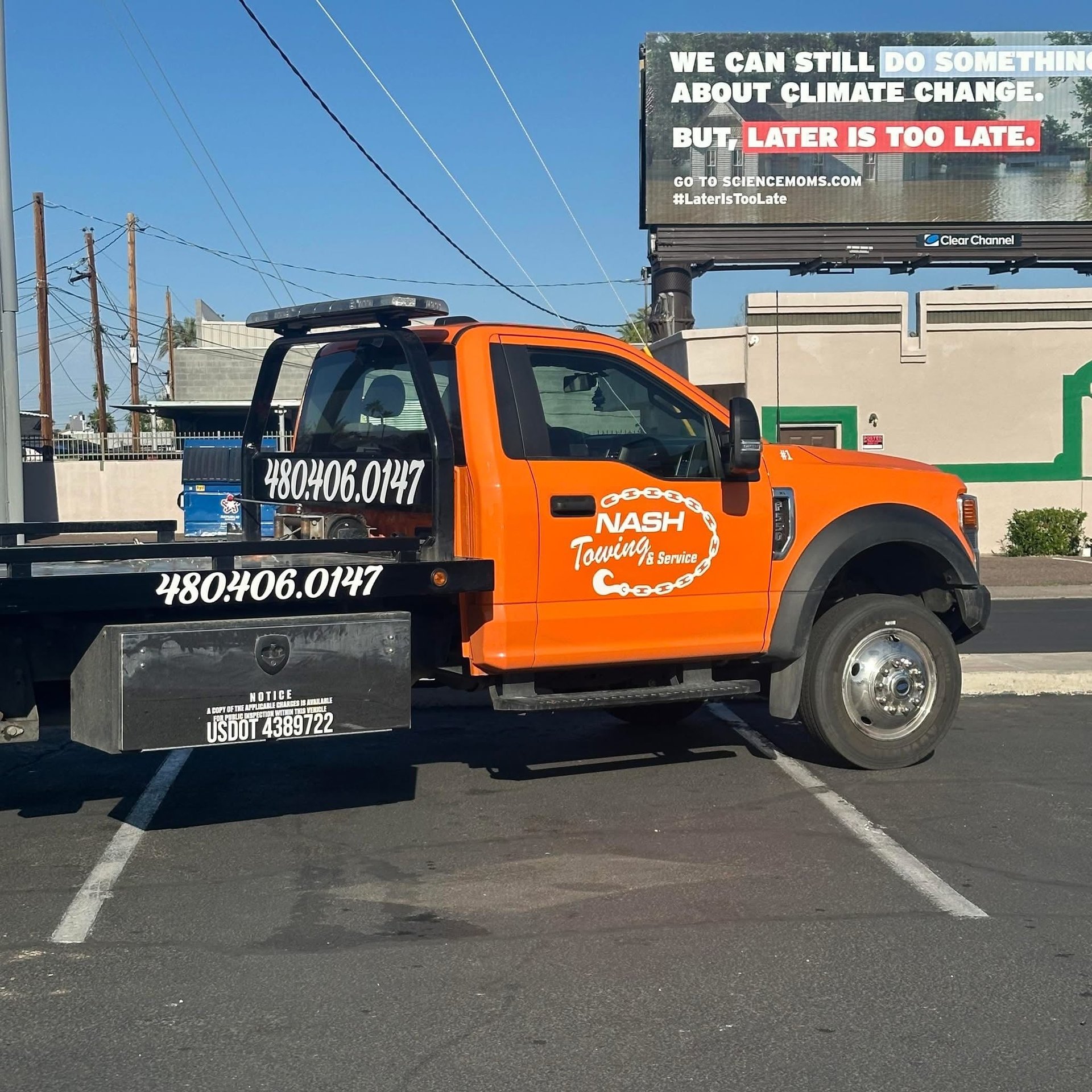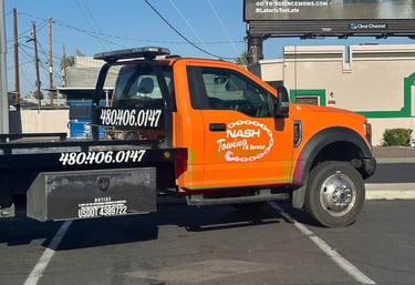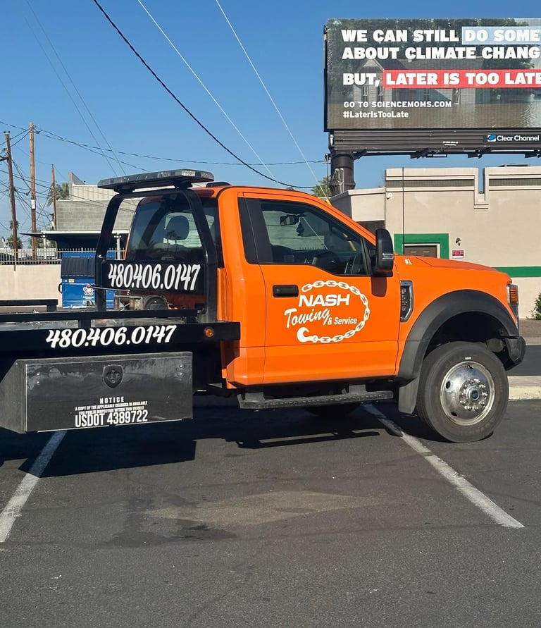 Stuck on the road? Call Nash Towing & Service at 480-406-0147 — we’ll be there in no time. Our bright orange F550 flatbed isn’t just for looks — it’s built for reliable, heavy-duty towing when you need it most. Whether it’s a breakdown, accident, or transport job, we treat every vehicle like our own.